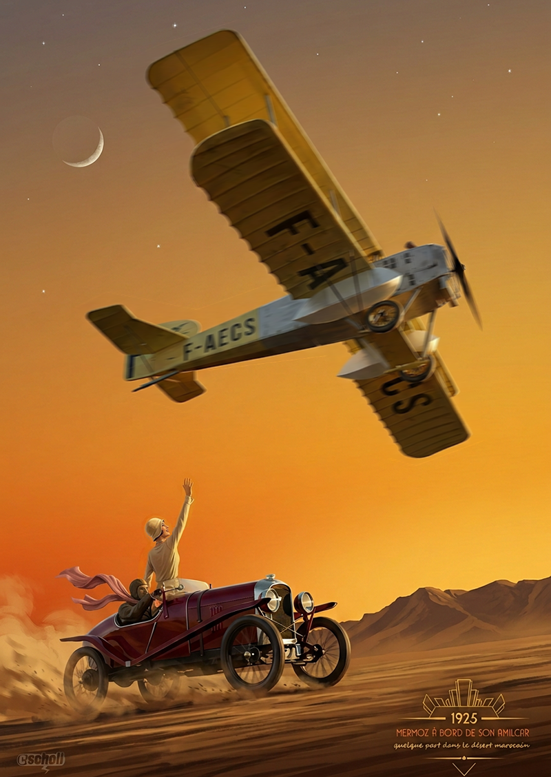 Cette illustration s’inspire des deux “héros” du film Courrier Sud de 1936 filmé en Mauritanie : les deux Laté 28.1 d’Air France